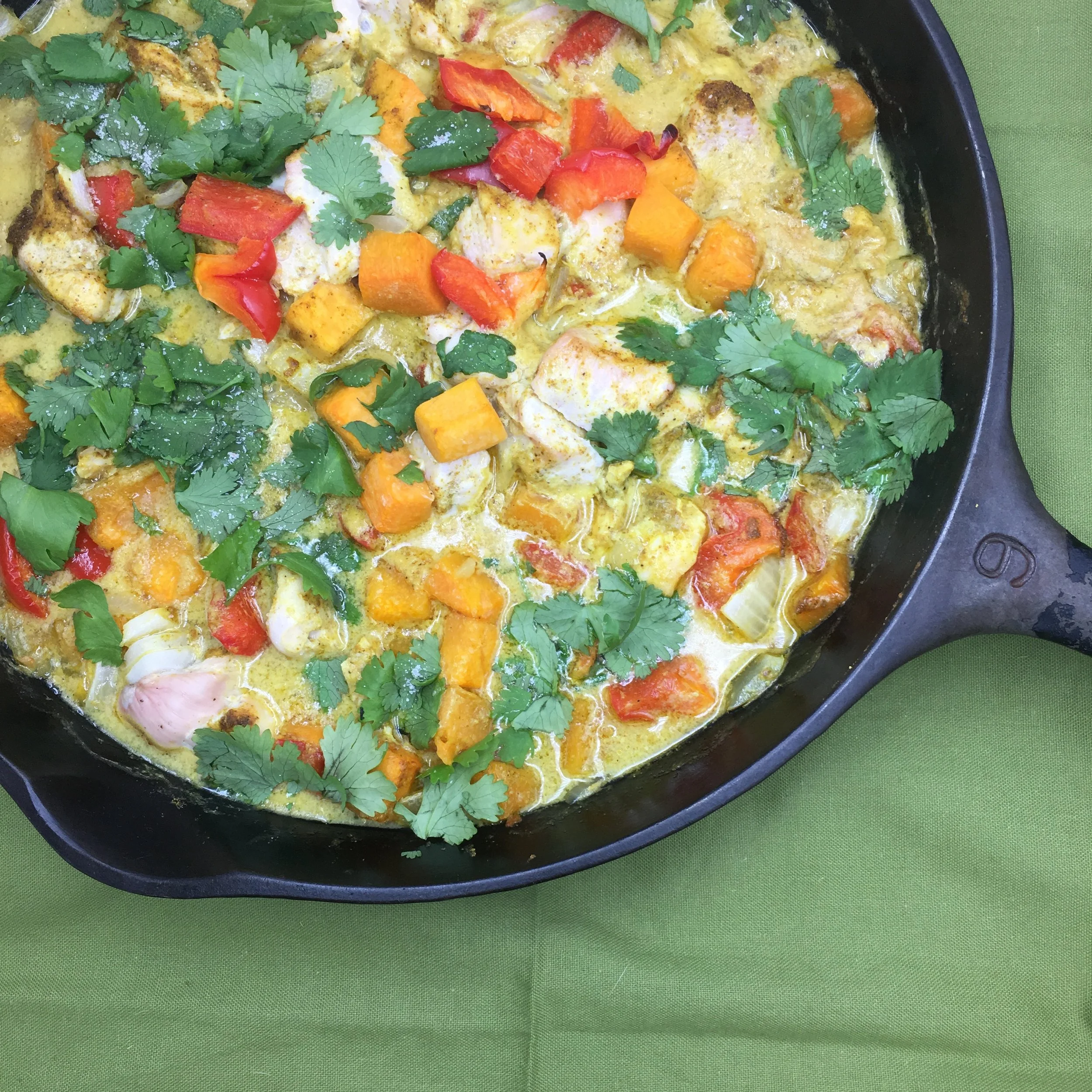 In large cast iron skillet, melt 1 Tbsp coconut oil on medium heat. Add the onion and cook for 1-2 minutes, followed by the bell pepper, and butternut squash. Saute veggies about 3-5 minutes. Add the chicken and pour the coconut milk, curry powder, salt & pepper on top of the entire mixture and toss together until chicken is well coated.