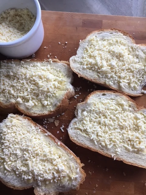 Take 1 medium piece of good bakery bread. French bread, sourdough, or baguette are fine choices. Gluten-free or sprouted bread is another option. Spread with 1 tsp butter and sprinkle on about 2-3 Tbsp shredded cheese of choice. You may also spread on 1 tbsp creamy burratta cheese, a soft mozzarella, or even a goat cheese. Add a thin slice of tomato if you'd like and a dash of oregano and toast in toaster 3 minutes or until cheese melts and it gets all nice and crispy.