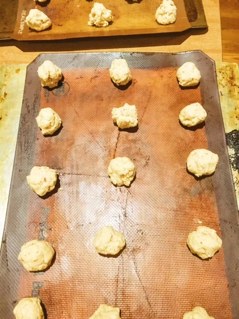 Shape mixture into 1-2 tsp sized balls onto a pan lined with silicon pad or parchment paper.