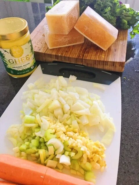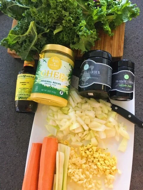 Saute the ghee with the onions, garlic, and ginger on medium heat for 2-3 minutes. Add turmeric and cook another 1-2 minutes. Add root vegetables and saute 1-2 minutes (add splash of water if veggies start to stick). Then add the celery and do the same. Finally add the broth and the veggie powders (if adding) followed by the kale (or leafy greens) and remainder of ingredients. Add additional salt and pepper to taste. Allow soup to cook 30-40 minutes. Cool slightly before serving.