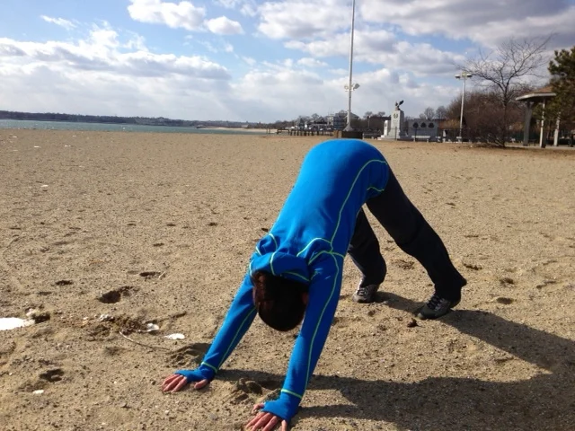 Warning: Do not try this pose outside in the wind! If I had a block with me, I'd place it under my right arm for balance, and to give more lift to my torso.
