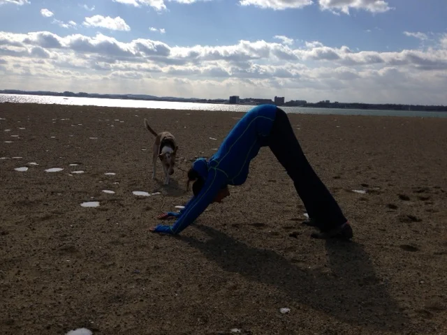 My dog, Willie is onto something! Every time he jumps off the couch he does this pose. Often described as “home base” in most vinyasa yoga classes, the down dog posture works every system of the body.